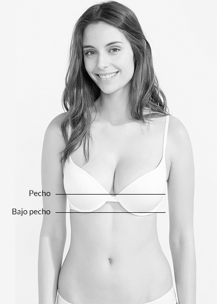 Para elegir la talla de sujetador más adecuada para ti, tómate las medidas de la siguiente manera:- Mide el contorno de tu pecho a la altura de los pezones (Pecho).